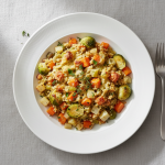 - Cuisson 15-18 min à couvert, feu moyen (95°C cœur), jusqu'à absorption complète du bouillon et tendreté des légumes.