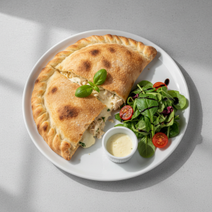 - Jour J – 20 min avant service : Formage calzones sur plan fariné. Pâte brisée pizza fraîche (70g brut/pièce). Déposer successivement : sauce tomate 20g, poulet effiloché 40g, champignons 15g, mozzarella 30g. Refermer en demi-lune, sceller les bords à la fourchette (critère de sécurité HACCP).