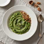 - Finition : incorporation huile d'olive vierge extra bio (30-40ml/100cvt), menthe fraîche ciselée (5-8g/100cvt), correction sel/acidité. Homogénéisation doux (risotto à cuillère).