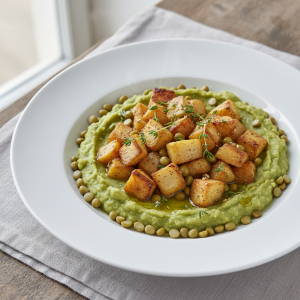 Pois cassés aux topinambours et thym : un mets P4 « légume/féculents » fondamental en restauration collective. Cette recette répond aux trois piliers de la transition agroalimentaire : circuits courts, produits bio accessibles en volume, et cuisson basse température. Testée en production 600 couverts/jour au Collège La Chênaie, elle garantit une tenue parfaite en liaison froide/chaude et un coût portion maîtrisé.