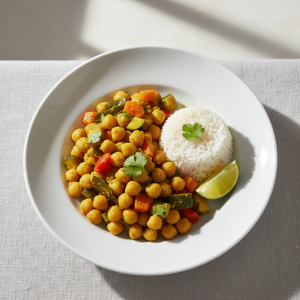 - Portion : 250g cuite/personne (100g pois chiches, 150g légumes-sauce). Servir chaud avec riz blanc ou complet (P5).