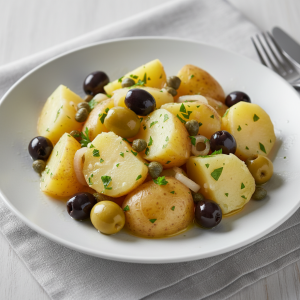 Ce plat d’accompagnement s’inscrit dans une démarche de cuisson basse température et de valorisation des produits bruts. Les pommes de terre cuites à la vapeur avec la peau conservent leur densité nutritionnelle (fibres, vitamines B, potassium) et limitent l’absorption de matière grasse. L’ajout d’olives noires bio et de câpres crée une saveur méditerranéenne riche sans dépendre de sauces ou d’huiles excédentaires.