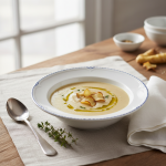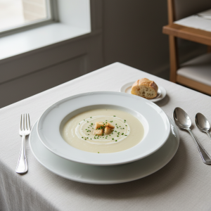 Ce potage répond aux critères de développement durable : cuisson courte préservant la valeur nutritionnelle, zéro déchet (valorisation des parures en bouillon), lait et crème issus de circuits courts fermiers certifiés. Conforme GEMRCN E2-S, portion de 250 mL, coût maîtrisé. À décorer d’un trait de crème et d’une pincée de muscade fraîchement râpée pour l’effet visuel en self ou table.