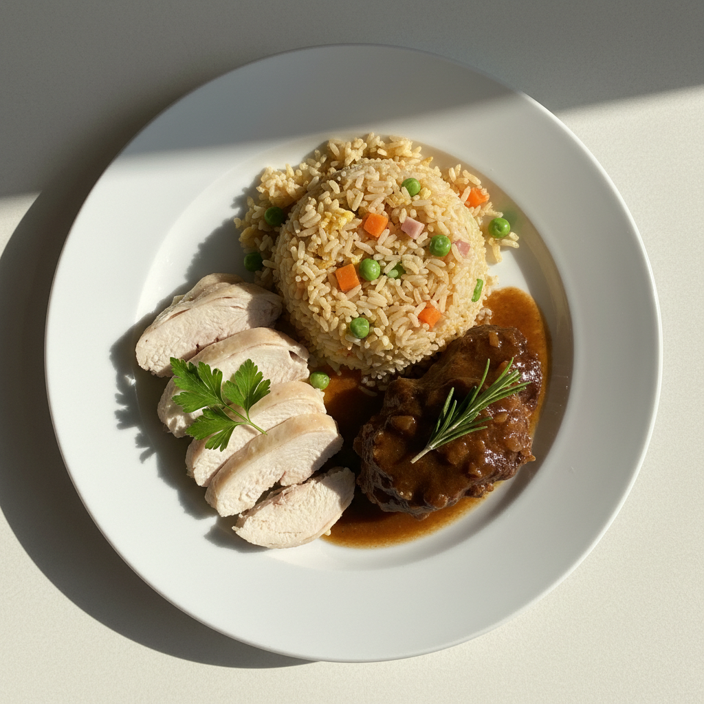 Déclinaisons : Texture modifiée : poulet effiloché + légumes mixés pour régimes spécialisés. Alternative végétarienne : tofu fumé mariné gingembre-sauce soja, même préparation vapeur. Variante bio : tous produits AB certificat. Adaptation sans allergène : remplacer sauce soja par bouillon de légumes bio + gingembre frais + sel réduit (4g/kg légumes).