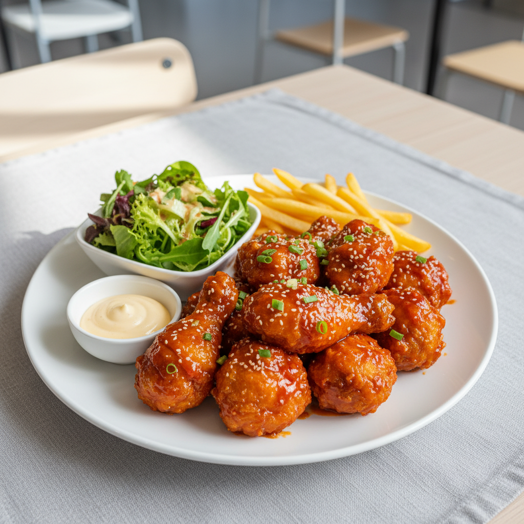 Cette recette P6 (Poulet frit et wings) respecte les obligations EGAlim (100% bio poulet + sources circuits courts régionaux). Elle offre une vraie valeur nutritionnelle (protéines 25-28g/100g), un impact environnemental réduit versus surgelés, et une flexibilité décisive pour les restrictions alimentaires (GF, végétarien). À ancrer dans les menus hebdomadaires en alternance avec cuissons basse température.