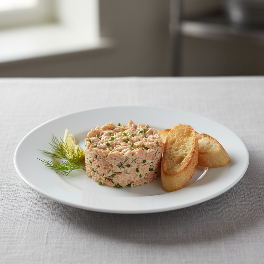 Déclinaisons : Texture modifiée (Dysphagie) : mixer plus finement, ajouter 10% de fromage blanc supplémentaire. Alternative végétarienne : rillettes de champignons de Paris + lentilles corail bio. Variante sans allergène lactose : remplacer fromage frais par purée d'amande bio + jus de citron frais. Sans gluten : validation list ingrédients (aneth/ciboulette).