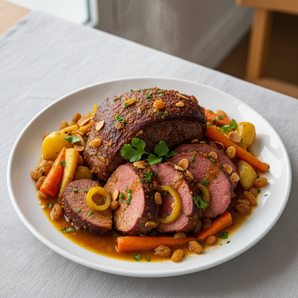 Déclinaisons : Texture modifiée : rôti broyé fin + liant (velouté maison) pour petits mangeurs. Alternative végétarienne : rôti de légumes anciens (betterave, navets, carottes), marinade identique. Variante bio : garantir label AB complet. Adaptation sans allergène : aucun allergène déclaré (consulter fournisseur ail poudré si présent).