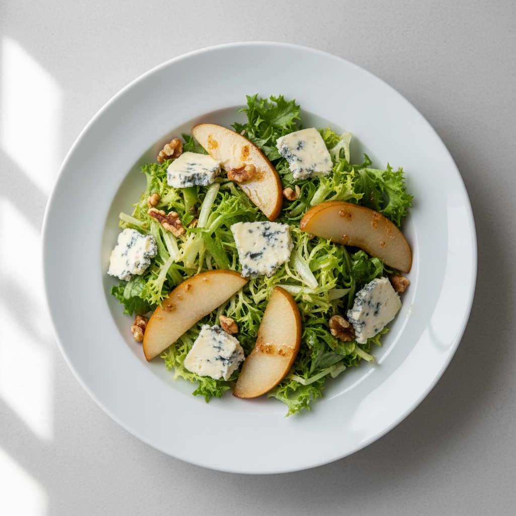 Déclinaisons : Texture modifiée (personnes âgées/dysphagie) : salade effilée fine + bleu mixé + poudre de noix. Alternative végétarienne : identification inutile (plat végétarien par essence). Variante vegan : remplacer bleu par tofu fumé bio ou crème de noix maison (80g tofu/50g cerneaux + miso blanc = 25g portion). Adaptation sans allergène noix : remplacer cerneaux par graines de courge grillées bio ou pignons de pin toastés.