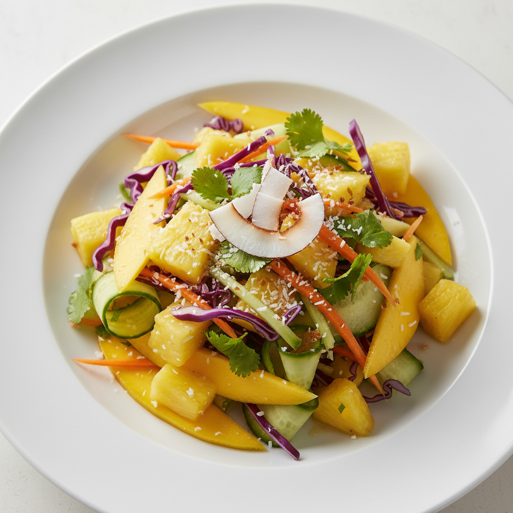 Déclinaisons : Texture mixée : mixer salade + ananas avec vinaigrette, ajouter noix de cajou finement hachées en topping (texture lisse pour dysphagie). Texture hachée : hacher grossièrement salade + ananas, concasser les noix. Alternative 100% locale été : remplacer ananas par melon charentais IGP ou pêches françaises Label Rouge. Variante protéinée : ajouter dés de tofu nature grillé (150g/100 cvts) ou fromage frais de chèvre AOP (80g/100 cvts). Sans fruits à coque : remplacer noix de cajou par graines de courge grillées ou pignons de pin. Version économique : remplacer ananas frais par segments d'orange en saison (janvier-avril), coût divisé par 2.