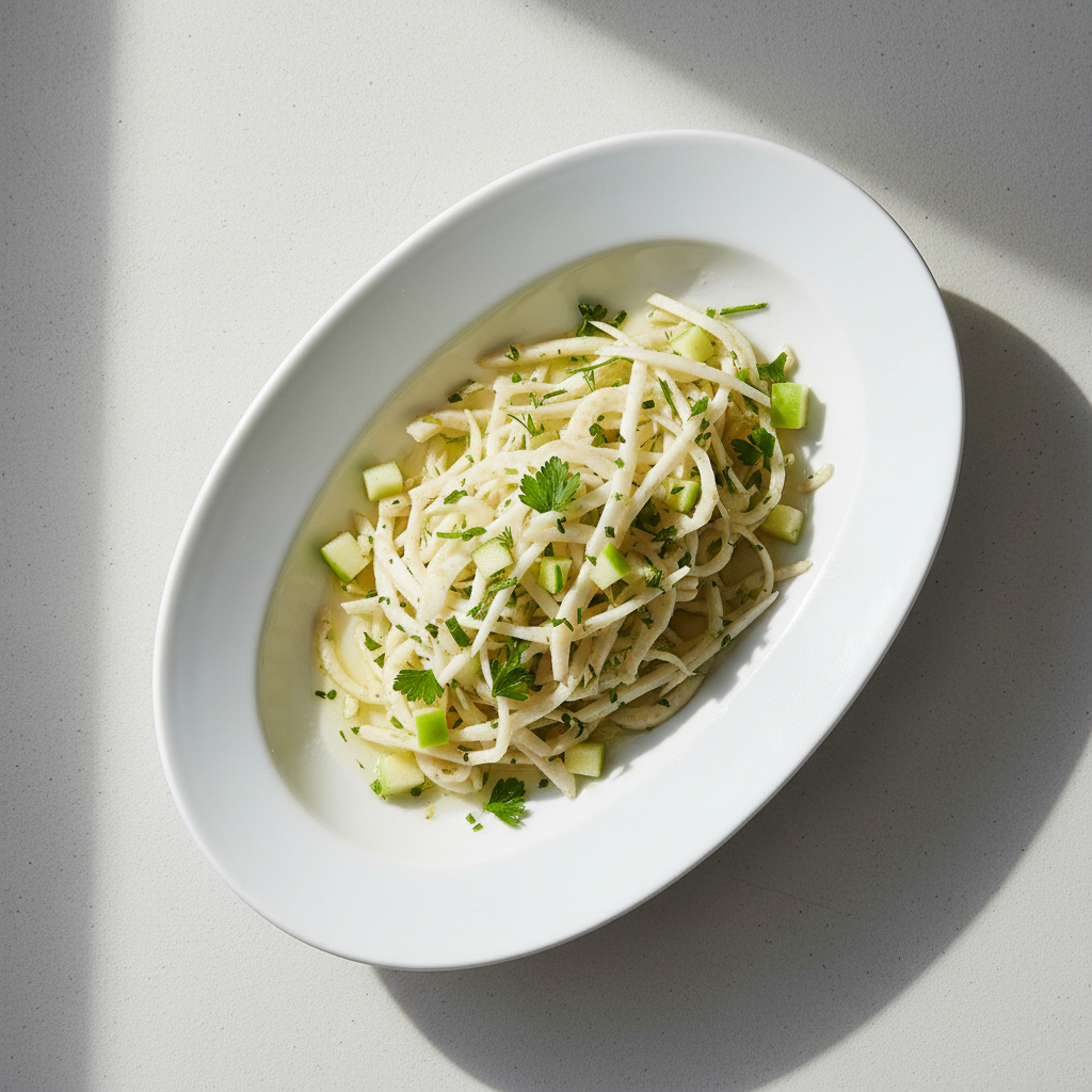 Cette salade de céleri-branche, pommes et noix incarne parfaitement la restauration collective responsable en saison froide. Classée GEMRCN E1 (entrée de crudités), elle valorise trois produits phares de l’automne et l’hiver disponibles en circuits courts : le céleri-branche cultivé dans les maraîchages du Sud-Est jusqu’en mars, les pommes de conservation françaises (Golden, Granny Smith) récoltées en septembre et disponibles jusqu’en avril, et les noix AOP de Grenoble à la saveur incomparable. Sur le plan nutritionnel, cette entrée végétale apporte fibres, vitamine C des pommes fraîches, oméga-3 des noix et antioxydants du céleri, tout en restant légère et digeste. L’assemblage sans cuisson garantit la préservation maximale des vitamines et représente un atout anti-gaspi majeur : zéro consommation énergétique, valorisation des parures de céleri en bouillon, et approvisionnement possible à 100% en bio local PACA.