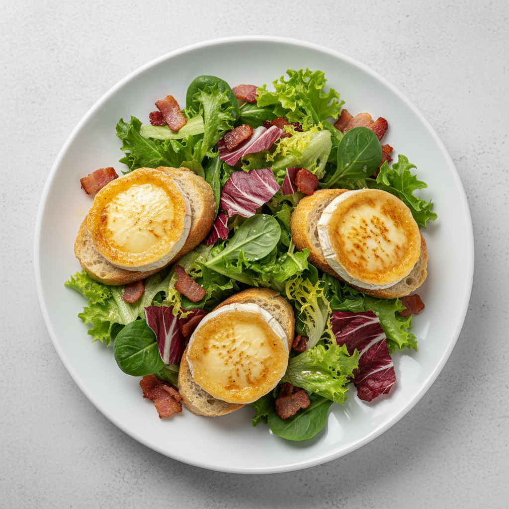 Déclinaisons : Texture modifiée (aphagie) : Salade mixée fine, chèvre écrasé, croûtons miette. Alternative végétalienne : Tofu nature bio grillé poêlé + levure nutritionnelle. Sans noix (allergie) : Graines de courge bio ou pignons de pin. Variante hivernale : Salade d'endives + betterave cuite, chèvre chaud identique.