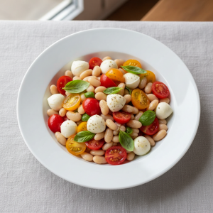 Organisation : J-1 : cuisson haricots à +63°C min 1h30, refroidissement rapide à +10°C en <2h, stockage hermétique +3°C max. Jour J (2h avant service) : assemblage des portions en barquette, maintien +3°C. Vinaigrage 15 min avant dressage uniquement pour éviter le ramollissement des tomates. HACCP : respect chaîne du froid, traçabilité producteur haricots et mozzarella, date de consommation max J+2 si liaison froide. EGAlim : 100% conforme EGAlim : haricots blancs bio certifiés (20-25% valeur achat), tomates cerises bio ou Label Rouge circuits courts régionaux (Provence, Pays de la Loire), mozzarella fermière AOP si possible (Italie du Nord ou production France certifiée), basilic frais AMAP locale. Estimation : 60% produits durables, 35% bio. Réduction drastique emballage plastique en restauration collective — barquettes compostables. Alternative végétalienne : remplacer mozzarella par fromage végétal fermenté ou tofu soyeux fumé.
