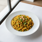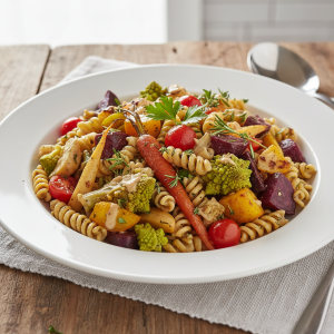 Déclinaisons : Texture modifiée : moulis légumes rôtis + pâtes tendres pour dysphagie. Alternative vegan : remplacer noisettes par graines courge rôties bio. Variante sans gluten : pâtes riz/maïs Rizopia certifiées. Sans fruits secs : pignons de pin rôtis. Sans céréale : remplacer pâtes par pois chiches rôtis ou lentilles corail.