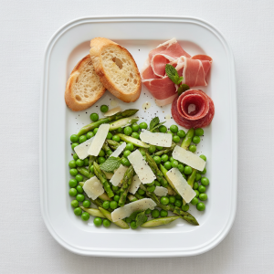 - Jour J 11h30 : Assemblage : lit petits pois froids + asperges grillées froides, 15g parmesan coupé en copeaux couteau économe par portion. Vinaigrette versée à la main (10 cl/portion) juste avant service.