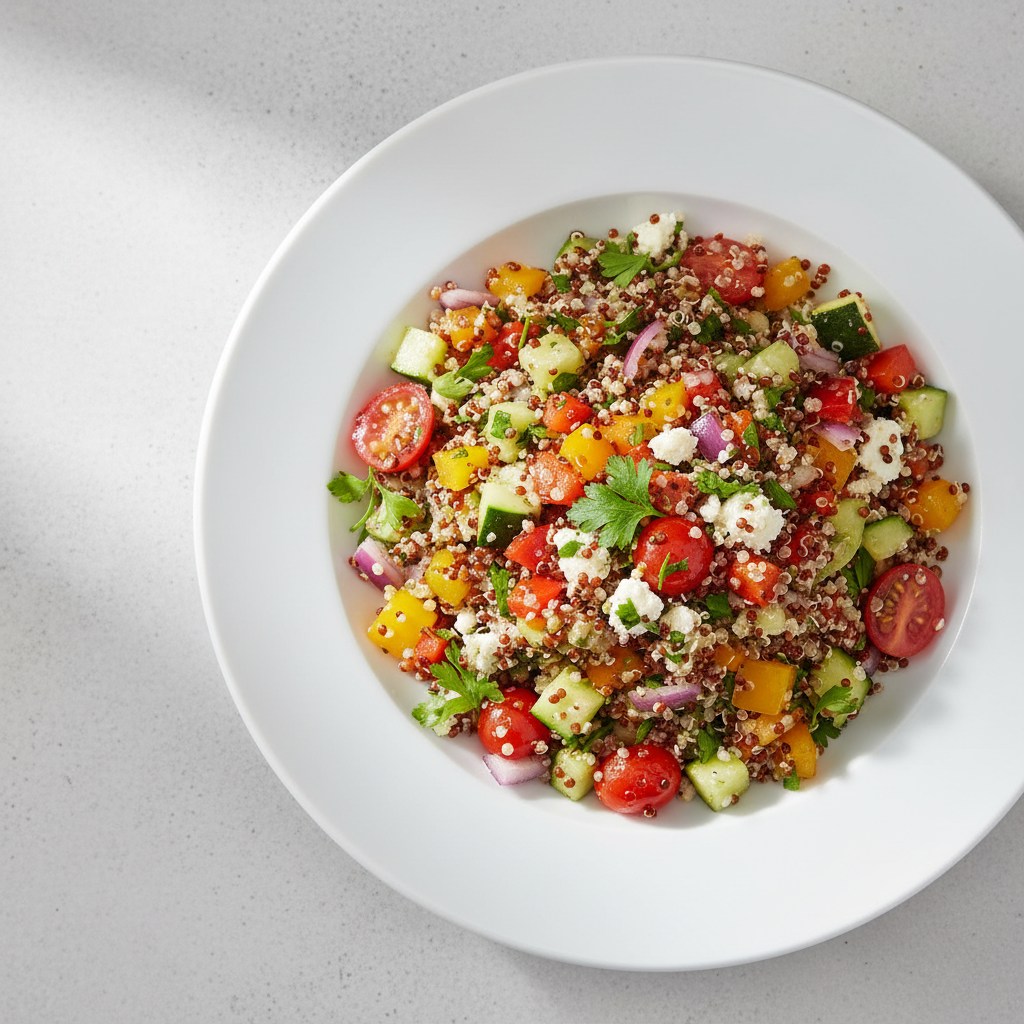 - Jour J 15 min avant service : Mélanger dans bac inox brossé : quinoa froid (350g/100 cvts) + légumes rôtis tiédes (600g/100 cvts) + féta émietée (150g/100 cvts) + huile d'olive vinaigrette (400 ml/100 cvts) + sel 4g/100 cvts (réduction -30% : féta salée). Goûter, ajuster herbes fraîches ciselées (persil, ciboulette).