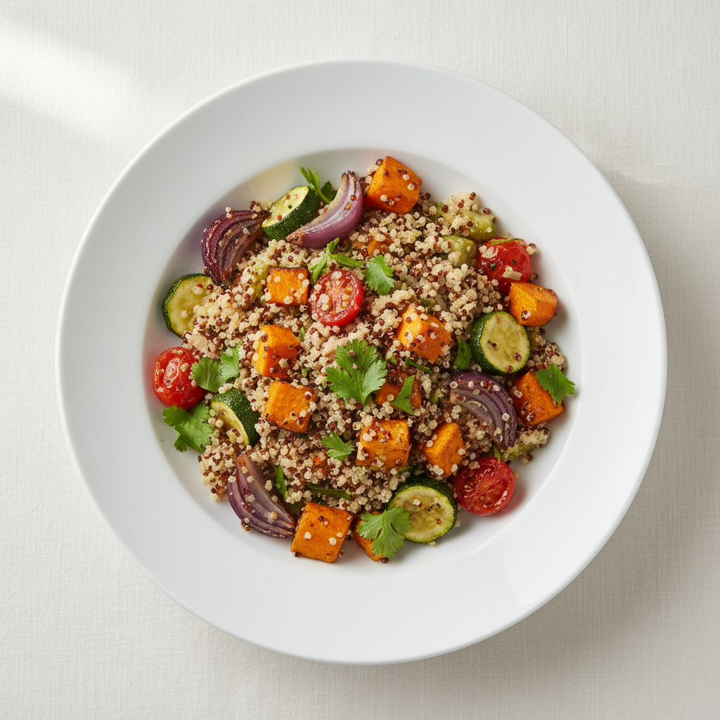 Déclinaisons : Texture modifiée (résidents dépendants) : quinoa écrasé grossièrement à la fourchette, poivrons taillés très petits (3mm), avocat réduit en purée lisse. Alternative végétarienne/vegan : recette de base 100% vegan (aucun ajustement). Variante bio labellisée : tous les ingrédients AB ECOCERT. Sans allergènes (arachides/moutarde) : vinaigrette citron-ail-huile olive (pas de moutarde).