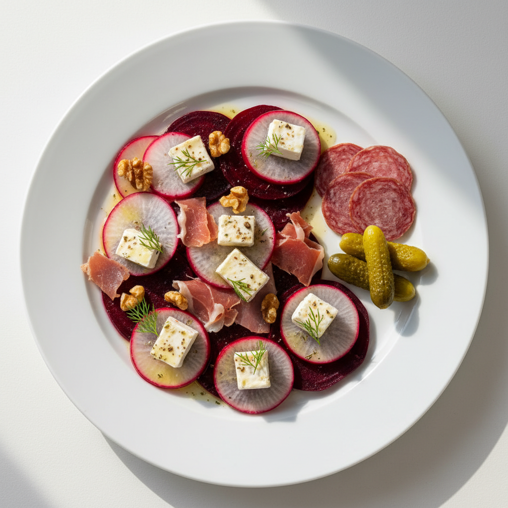 - J service (30 min avant) : mélanger radis juliennés + 60% de la vinaigrette en saladier froid (+4°C). Laisser reposer 5 min. Dresser assiette froide (+8°C max), ajouter légumes grillés, parsemer 25g pignons de pin torréfiés, filet vinaigrette restante. Service immédiat ou conservation +3°C 30 min max.