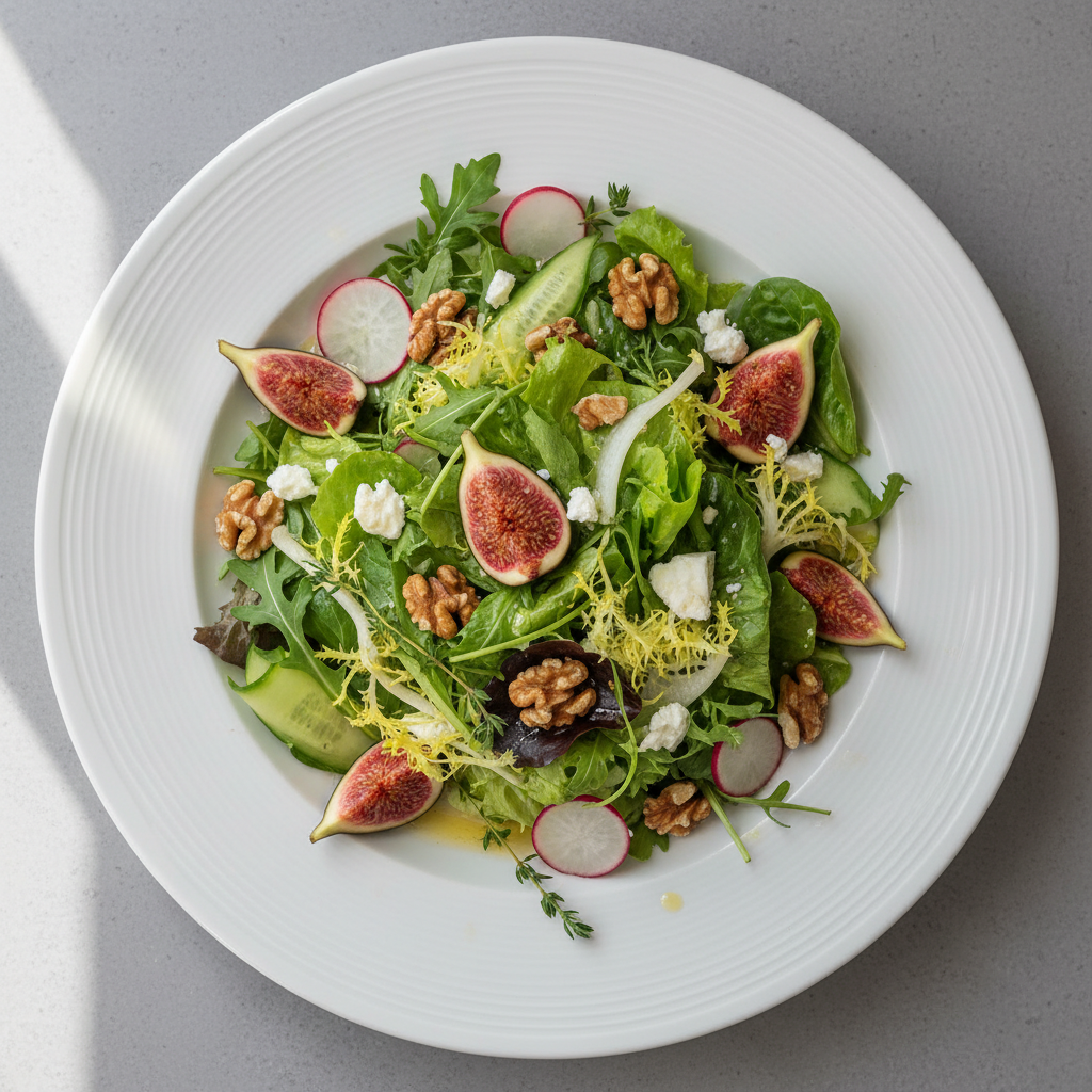 Sans allergène (œuf, lait, moutarde) : Remplacer féta par pois chiches rôtis (protéines, circuit court). Vinaigrette sans émulsifiants : huile bio + vinaigre balsamique + citron + origan frais.