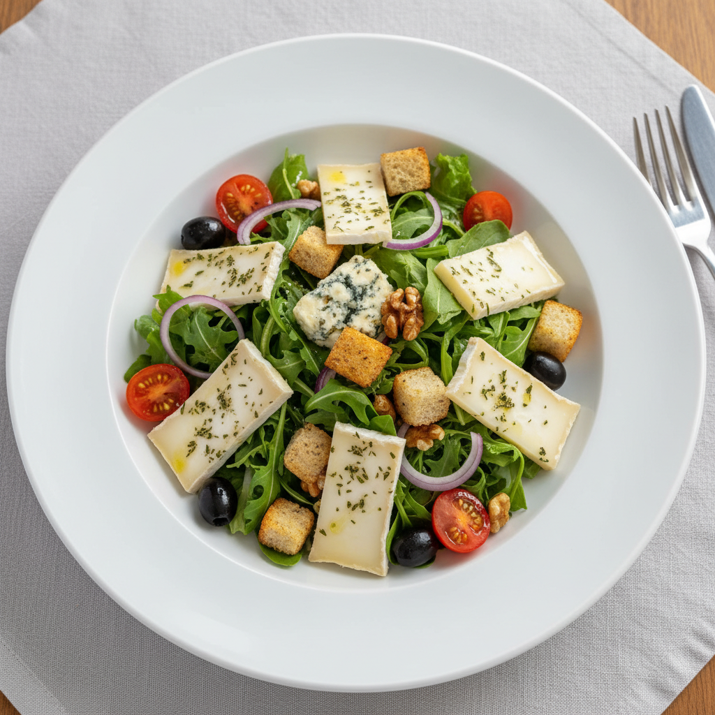 EGAlim : Conforme EGAlim : salade verte bio recommandée (label AB ou équivalent), noix bio préférence circuits courts (AMAP, producteurs locaux Nouvelle-Aquitaine). Gésiers et magret : privilégier canard fermier Label Rouge ou AOC (Périgueux, Challans). Vinaigre et huile bio ECOCERT. Estimation : 35-40% bio en valeur d'achat. Alternative végétarienne possible : substituer gésiers/magret par lardons de tofu fumé bio ou champignons de Paris rôtis.