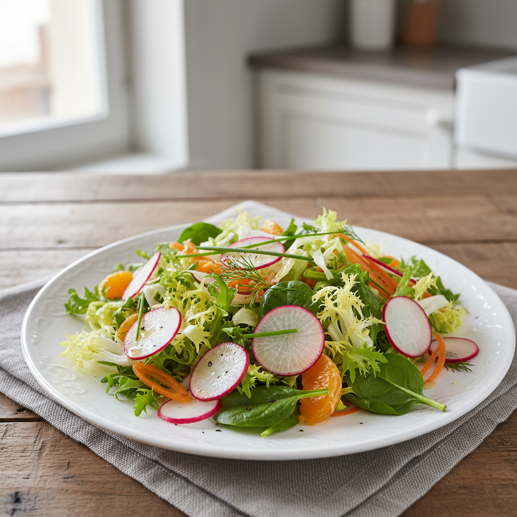 Cette salade entre E1 (entrée/crudités) offre une marge de manœuvre intéressante sur les approvisionnements locaux : tatsoi cultivé en Provence (producteurs émergents), radis des AMAP, ciboulette fraîche. Coût portion maîtrisé, impact carbone minimal, adhésion enfants garantie par la texture croquante. À proposer en alternance avec d’autres crudités bio pour diversifier l’offre végétale et renforcer la communication développement durable auprès des parents.