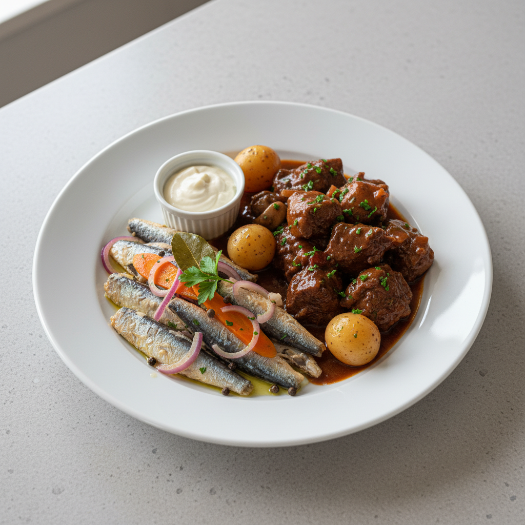 EGAlim : Conformité EGAlim : sardines fraîches de pêche côtière (label MSC recommandé) ou conserves à l'huile d'olive bio ECOCERT. Tomates fraîches bio en saison, conserves bio pelées si saison creuse. Huile d'olive vierge extra bio (15-20% du coût matière). Oignon/ail producteur local AMAP ou marché régional. Estimation : 60% produits durables (dont 25% bio en valeur) = conforme EGAlim niveau 3.