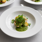 - J-1 : Trier et laver coriandre/persil frais à l'eau glacée (hygiène + maintien turgescence). Hacher finement au couteau (limite oxydation vs mixeur). Peser : 300g coriandre + 200g persil pour 100 couverts.