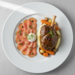 - Réchauffer pommes de terre vapeur (3-4 min) et haricots (2 min). Placer 150g saumon + beurre maître d'hôtel 15g sur assiette chauffée ≥63°C.