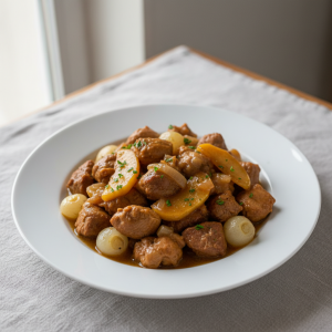 - J : Brunir la dinde à sec en sauteuse 180°C, 8 min (caramélisation légère Maillard). Déglacer au cidre brut, ajouter oignons émincés, pommes taillées en quartiers épaisses.