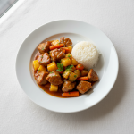 Déclinaisons : Texture modifiée : cuisson +15 min pour résidents âgés. Alternative végétarienne : remplacer porc par tofu ferme ou pois chiches (cuisson identique). Variante bio : utiliser porc AB fermier français + épices colombo bio. Sans allergène : lait de coco peut être remplacé par bouillon légume additionné de crème fraîche (réduire quantité matière grasse).