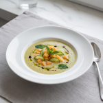 - Dressage : verser en soupière émaillée réfrigérée (200 mL portion adulte collège, 180 mL enfant école), décor menthe fraîche 1 brin, filet huile olive bio NF (1 mL/portion). Servir aussitôt, chaîne du froid stricte.