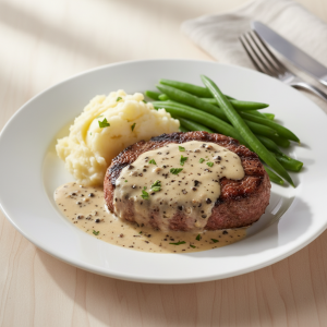 - Accompagnement végétarien : Remplacer steak bœuf par steak lentilles corail/betterave bio (120g, pré-cuit). Poêler 2 min côté 1, 2 min côté 2. Même sauce poivre-crème maison. Apport protéique 12-14g (pois chiche possible aussi). Traçabilité Bio équivalente.