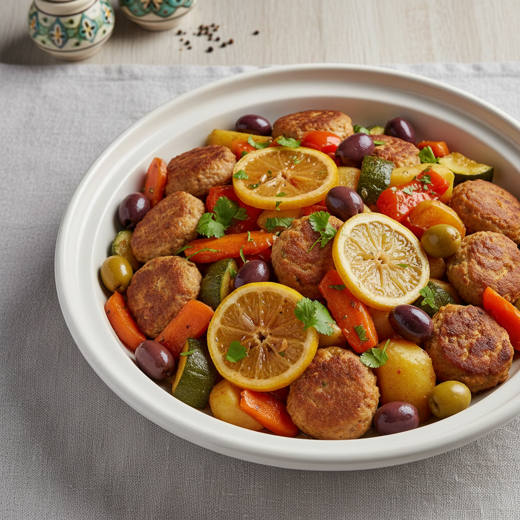 Déclinaisons : Texture modifiée : Mixer tajine complet (légumes + boulettes émiettées) pour personnes âgées ou dysphagie — lier avec bouillon réduit si nécessaire. Alternative végétarienne : Remplacer boulettes viande par falafels pois chiches-cumin ou boulettes végétales lentilles corail-boulgour-œuf, ratio 80g/portion. Ajouter 100g pois chiches cuits bio pour protéines complètes. Sans allergène : Version sans fruits à coque (retirer amandes, augmenter fruits secs), remplacer œuf dans boulettes par 30g chapelure humidifiée + 1 CS graines de lin moulues. 100% bio : Viande hachée AB France, légumes AB régionaux, fruits secs et épices AB — surcoût +1,20€/portion. Populations YOPI : Cuire boulettes ≥ +70°C à cœur (viande hachée populations sensibles), éviter miel pour enfants < 1 an (remplacer par sirop dattes).