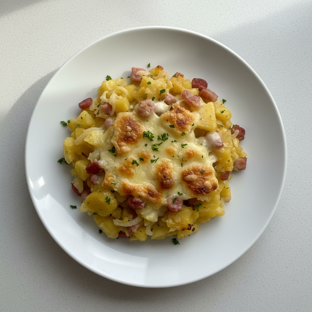 Déclinaisons : Texture modifiée : purée de pommes de terre + gratin pour enfants ayant difficultés mastication. Alternative végétarienne : Tartiflette aux champignons de Paris poêlés + noix concassées (protéine végétale). Variante bio : tous ingrédients certifiés ECOCERT, munster bio Alsace. Sans allergène lait : crème d'avoine bio + fromage fermenté végétal non sulfité.