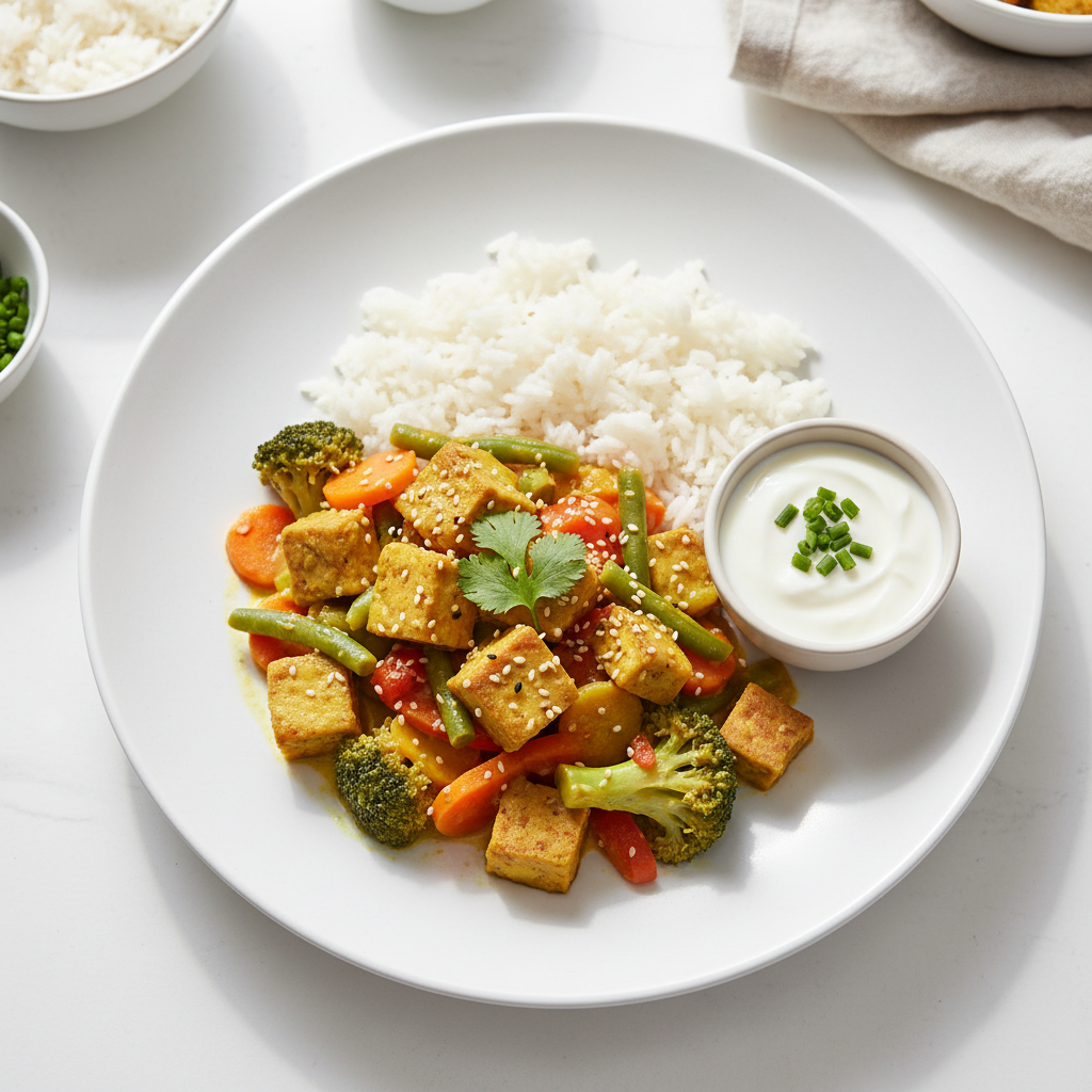 EGAlim : Conforme EGAlim 2022 : tempeh bio certifié ECOCERT ou équivalent (source protéine durable +20% bio). Beurre de cacahuète bio, lait de coco bio. Légumes frais de saison privilégier circuit court régional (AMAP, producteur local). Sauce soja tamari certifiée, citron vert non-traité. Estimation bio : 85-90% de la recette en valeur d'achat. Alternative arachide (allergie) : sauce tahini-coco avec miso blanc.