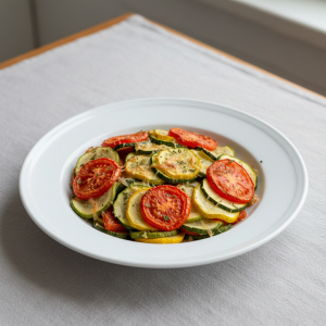 • Jour J (15 min avant cuisson) : Montage en plat 24×32 cm : aligner tranches courgettes, intercaler tomates concassées, oignons, ail, herbes de Provence séchées. Napper huile d'olive vierge extra bio (0,4 ml/100 couverts). Saler réduit 4g/kg (courgettes pré-salées).