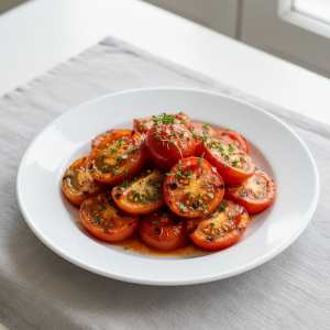 - Cuisson four 190-200°C ou grill réglé 200°C : disposer tomates côté coupé face source chaleur. Durée 18-20 min jusqu'à cœur ≥85°C (validation thermomètre infrarouge). Cuisson unie, léger caramélage.