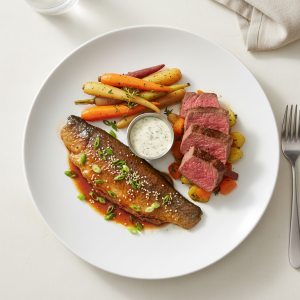 Plat P1 (poisson) conforme GEMRCN : 150g truite/portion, apport protéines 27g, lipides 12g (profil cardio-protecteur). Sauce 25g maison limite sucres simples (mirin bio ≤8g/100ml). Déclinaisons prêtes pour publics fragilisés (dysphagie, allergie gluten via tamari). Références fournisseurs circuits courts : AMAP régionales, marchés de gros bio certifiés, piscicultures label ASC pour durabilité aquacole.