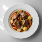 - Couvrir hermétiquement et enfourner à 160°C (chaleur tournante) pendant 90 minutes. Ou braiser en marmite à feu très doux, couvercle, même durée. Vérifier à mi-cuisson, ajouter du bouillon si nécessaire. Économie d'énergie : cuire en four pleine charge (autres plats simultanés).