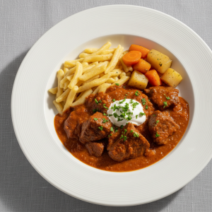 Le veau à la hongroise (goulash) est un classique de la restauration collective qui séduit par sa texture fondante et son parfum de paprika. Cette recette met en valeur l’épaule de veau Label Rouge ou bio, braisée longuement avec des oignons, tomates, poivrons et crème fraîche, pour un résultat généreux et équilibré. Riche en protéines de haute qualité (28g/portion), en fer héminique et en vitamines du groupe B, ce plat convient parfaitement aux convives de tous âges, y compris en restauration scolaire et sociale. Les légumes frais de saison (tomates et poivrons d’août à octobre) permettent d’optimiser la fraîcheur et le sourcing local, tandis que le braisage basse température garantit une cuisson maîtrisée et une économie d’énergie significative.