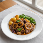 - Immerger veau brunissage + carottes + pommes de terre + tomates. Couvrir, braiser à four basse température 65°C (cocotte) ou 75°C (cœur viande) 85–95 min. Contrôle cœur à +75°C min avec thermomètre interne.