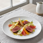Points forts : biodégradabilité 100% (zéro déchet d’emballage avec achats vrac), valorisation des parures (fonds de veau), alternative végétale testée en parallèle. À reproduire en liaison froide avec refroidissement accéléré +63→+10°C en <90 min pour les cuisines décentralisées.
