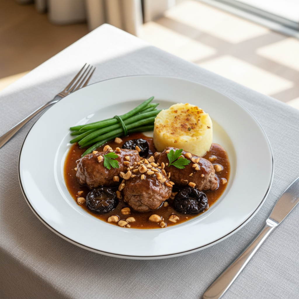 Un classique GEMRCN rentable et durable : viande fermier locale, fruits secs bio certifiés, fond maison zéro déchet. Encadrement HACCP simple, organisation J-1/Jour J fluide. À proposer en alternance avec l’alternative végétarienne braisée (champignons, céleri) pour diversifier l’offre et réduire l’empreinte carbone collective.