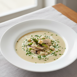 Velouté Agnès Sorel — un incontournable de la restauration collective française. Cette soupe veloutée, née de la haute cuisine classique, trouve sa place naturellement en restauration collective : peu coûteuse en labor, facilement déclinable, économe en matières grasses (max 300g beurre/100cvts). Notre approche privilégie volaille fermière Bio Label Rouge (20% bio EGAlim) et champignons de circuit court régional, garantissant saveur et conformité développement durable.