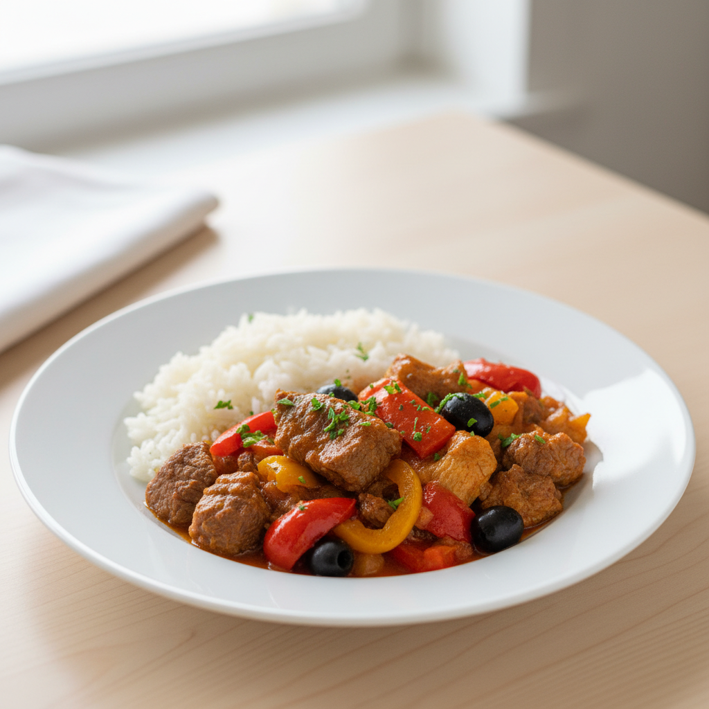 Déclinaisons : Texture modifiée : escalopes hachées/effilochées pour personnes âgées, cuisson +10 min. Alternative végétarienne : remplacer volaille par seitan bio ou champignons de Paris sautés (cèpes déshydratés réhydratés = apport umami équivalent). Variante bio : tous produits Label AB, chorizo bio. Sans allergène gluten : certifier chorizo (risque d'amidon de maïs/blé) — privilégier charcuterie iberica pure épices.