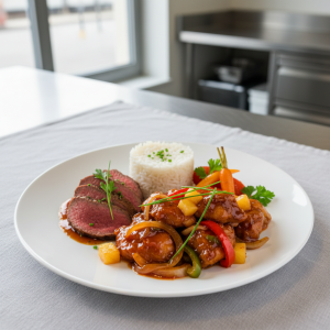 Volaille aigre-douce façon wok asiatique : un classique incontournable de la P1 qui permet de valoriser les produits frais locaux et bio. Cuisson maîtrisée à feu vif garantissant moelleux du blanc et texture croustillante, ananas frais ajouté en fin de cuisson pour préserver le fruité. Conforme EGAlim avec circuits courts Provence et sauce maison sans additif.