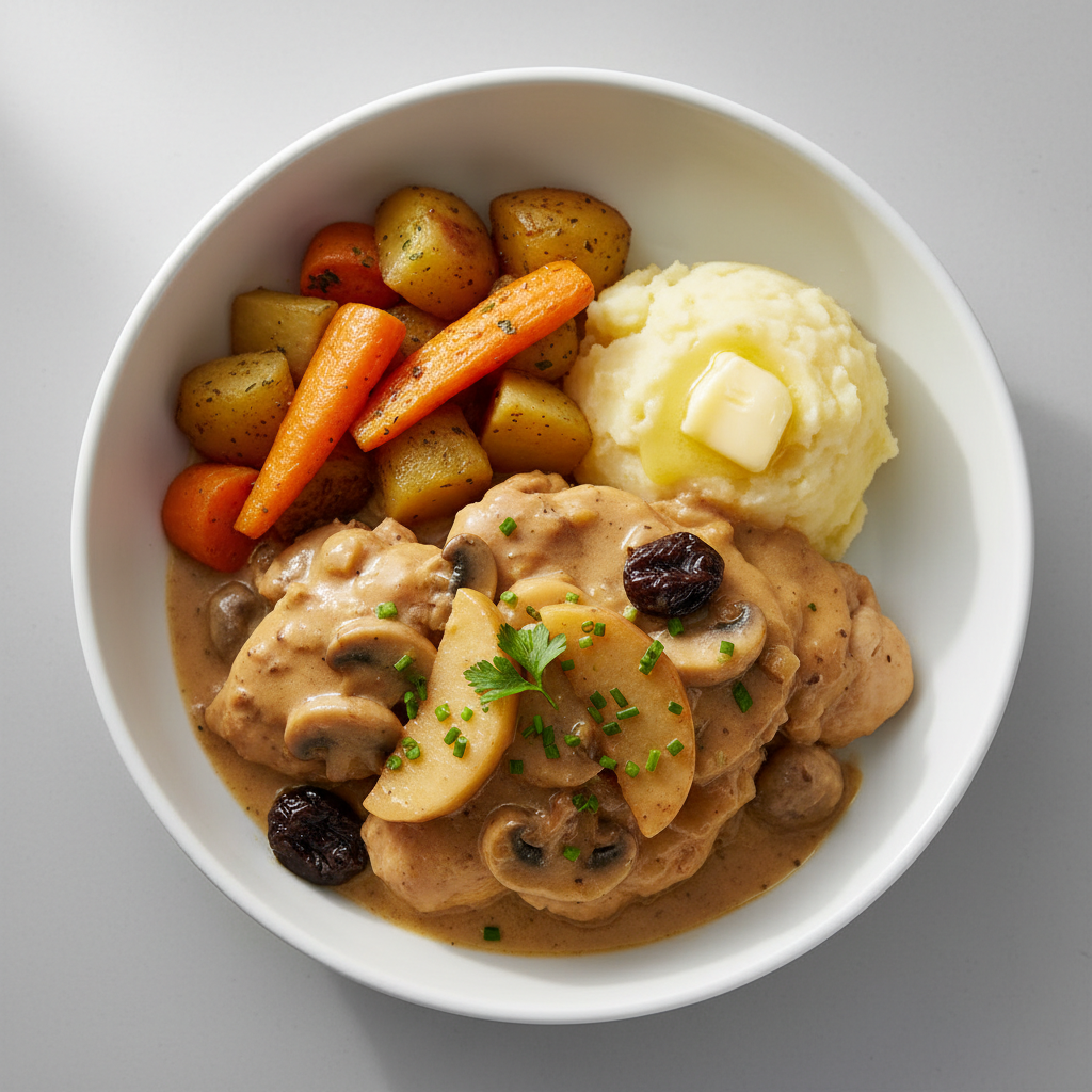Déclinaisons : Texture modifiée (dysphagie) : volaille effiloché fin + réduction sauce jusqu'à purée lisse. Alternative végétarienne : bloc tofu fumé ou champignons sauvages (cèpes, girolles) + même fond cidre. Variante bio : tous ingrédients ECOCERT. Sans allergène lait : crème fraîche remplacée par crème de soja ou purée amande (ajuster liaison).