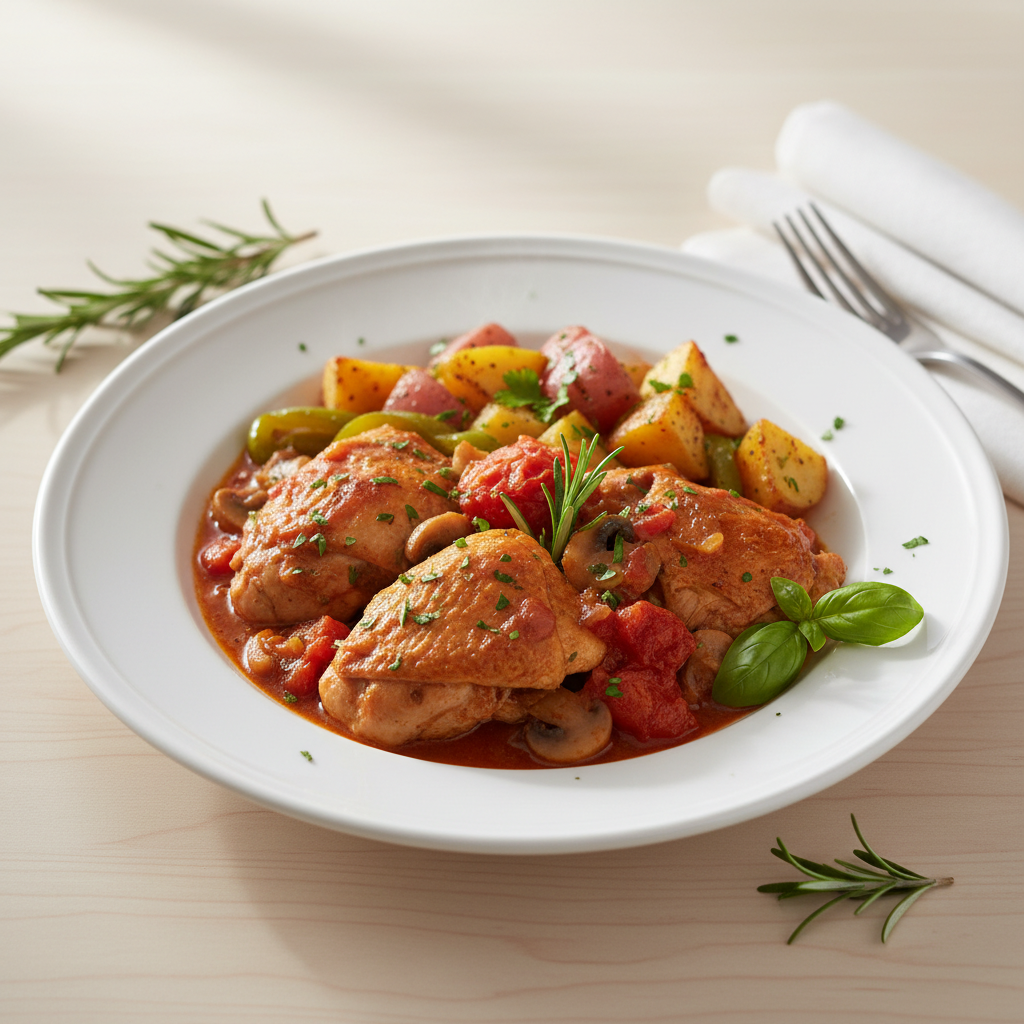 Déclinaisons : Texture modifiée : volaille effilochée pour résidents dépendants ou dysphagie (texture mixée, sauce liée). Alternative végétarienne : tofu fermier ou pois chiches grillés à la place volaille (même sauce basquaise, même cuisson 25 min). Variante bio certifiée : volaille fermière bio Label Rouge, légumes AMAP locaux. Sans allergène : vérifier provenance ail et piment doux (traces gluten industrie).