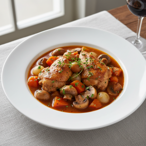 - Cuisson J : Coloration volaille par petits lots (500g max) cocotte 190°C fond huile 0,8cm, 3–4 min peau côté fond = développement sucres/arômes Maillard. Température cœur 65–70°C avant ajout liquide.