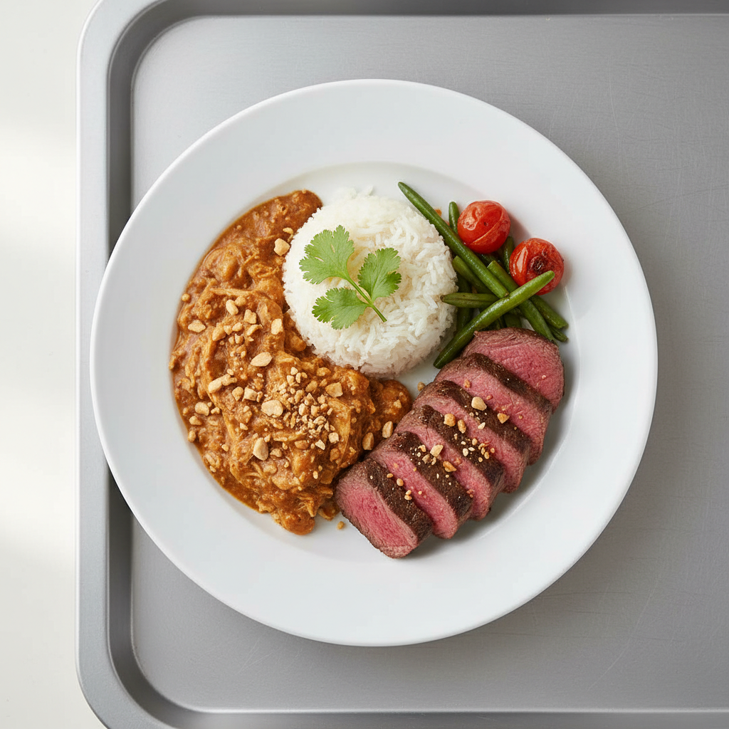 Déclinaisons : Texture modifiée (dysphagie) : émincer volaille finement, lier sauce avec poudre d'arachide + Maïzena pour fluidité contrôlée. Alternative végétarienne : remplacer volaille par pois chiches ou lentilles corail (cuisson 25 min). Variante vegan : arachides + lait de coco Bio. Adaptation sans allergène arachide : sauce tomate-cacahuète remplacée par sauce tomate-sésame (graines sesame broyées).