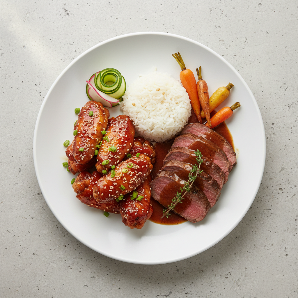 Déclinaisons : Texture modifiée : ailes effilochées pour dysphagie. Végétarienne : wings de chou-fleur rôti + même sauce teriyaki. Vegan : sauce tamari sans gluten pour intolérance soja. Sans gluten : sauce tamari certifiée, vermicelles riz en accompagnement.